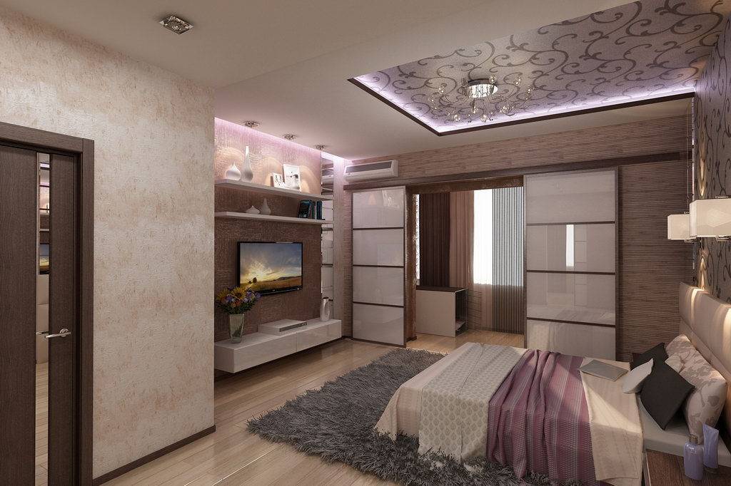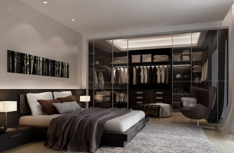 Если спальня и гардеробная находятся в одном помещении, лучше как-то визуально разделить пространство. Это не относится к полноценному участку для хранения одежды, организованному в нише и отгороженному дверями.