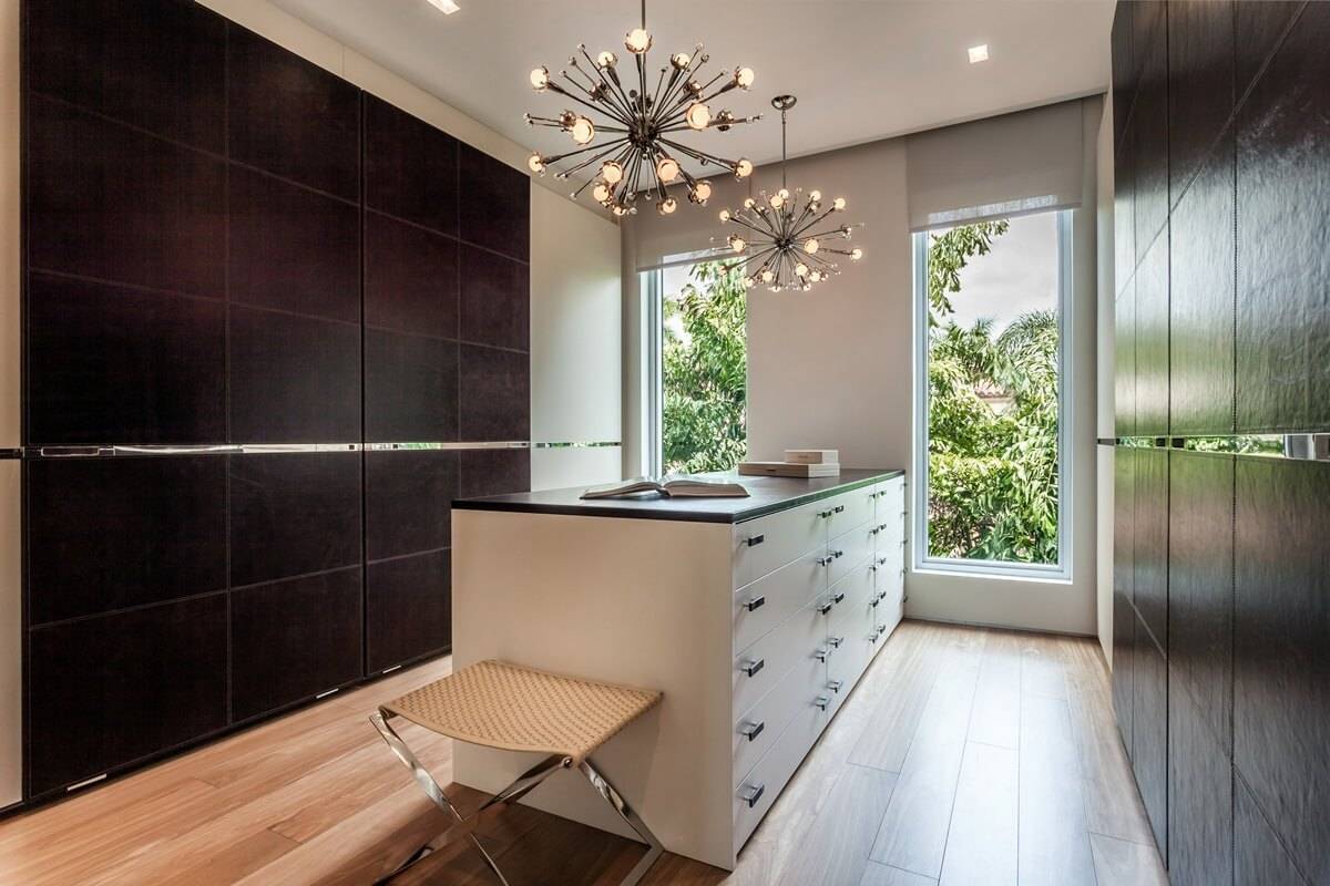 Света в гардеробной должно быть максимально много. С таким важным фактором лучше не экспериментировать, позаботиться о наличии естественного и искусственного освещения. Для достижения идеального результата используют большую люстру в центре потолка и точечные светильники в определенных зонах. Лампы также встраивают по периметру потолка и в стены, для подсветки зеркал, обувницы, полок.