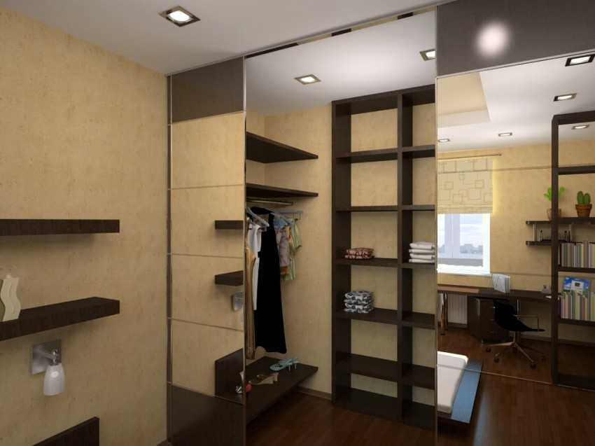 Если гардеробная открытая, можно выделить ее с помощью цвета или света. Функциональный и оригинальный вариант зонирования — зеркальные перегородки.
