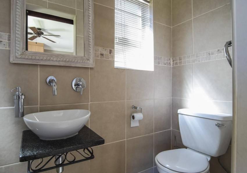 - умывальник утоплен в столешницу; под умывальником расположены закрытые секции для хранения; светильники подвесные, свисают с потолка; зеркало на всю ширину стены;