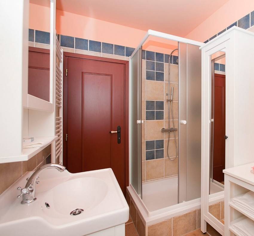 - душевая кабина квадратная, прямоугольная или обустроенный поддон, огороженный панелями-шторками.