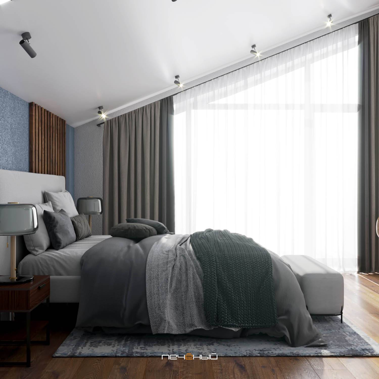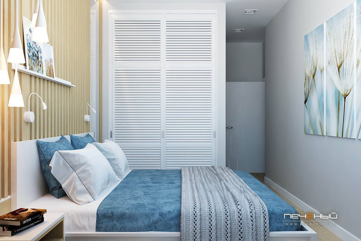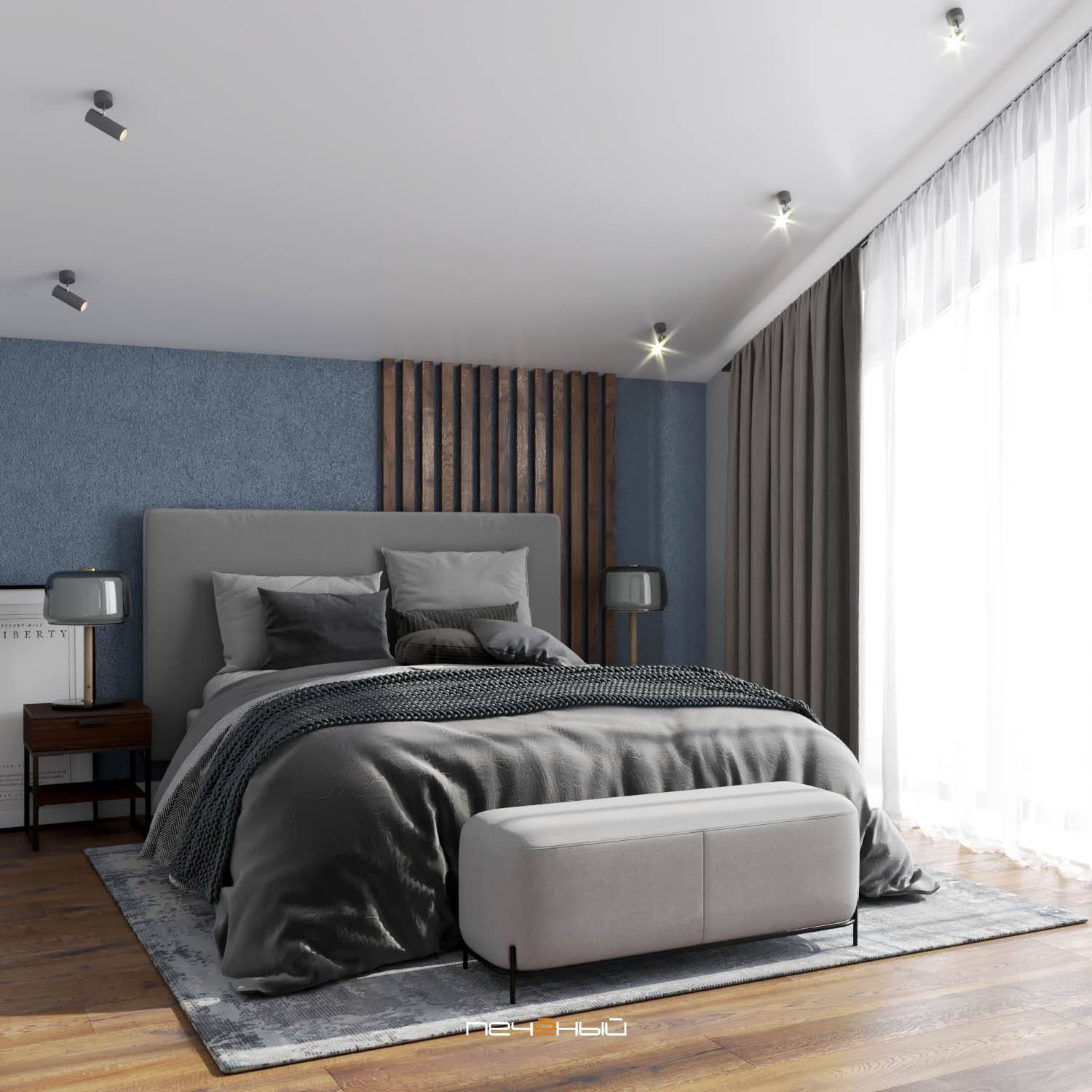 Многие согласятся, что ради просторной гардеробной можно и пожертвовать пространством спальни. А чтобы этот светлый серо-синий интерьер визуально смотрелся легче, мы использовали в оформлении стены деревянные вертикальные рейки. Вместе с жалюзийными дверцами гардеробной они добавляют воздуха в крошку-спальню и создают дополнительные горизонтальные и вертикальные линии.