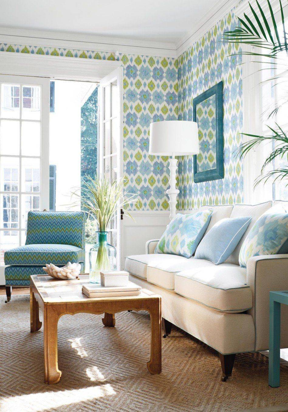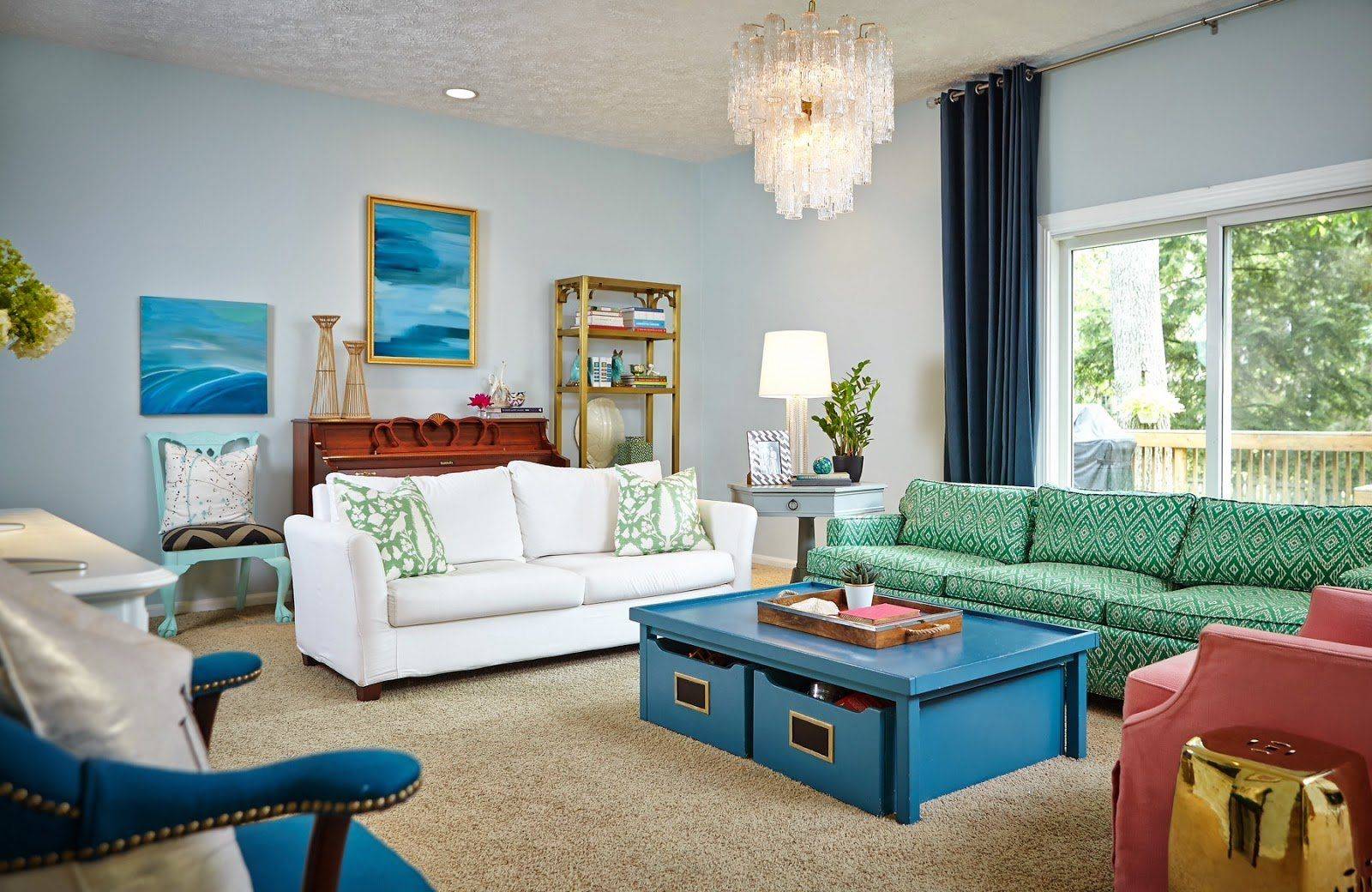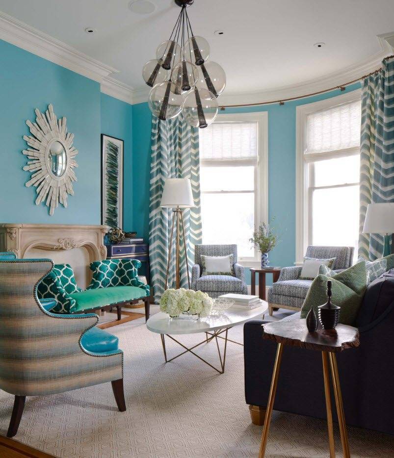 Еще одно необычное решение — голубой в гостиной в сочетании с фиолетовым или зеленым. Сначала может показаться, что цвета не совпадают. Однако, ища вдохновения, вы обнаружите, что это неправда. Поверьте, это отличное и оригинальное сочетание. Фиолетовый зал можно обустроить голубыми аксессуарами в виде декоративных бутылочек, подушек и рисунка. Голубой в сочетании с зеленью также отлично смотрится.