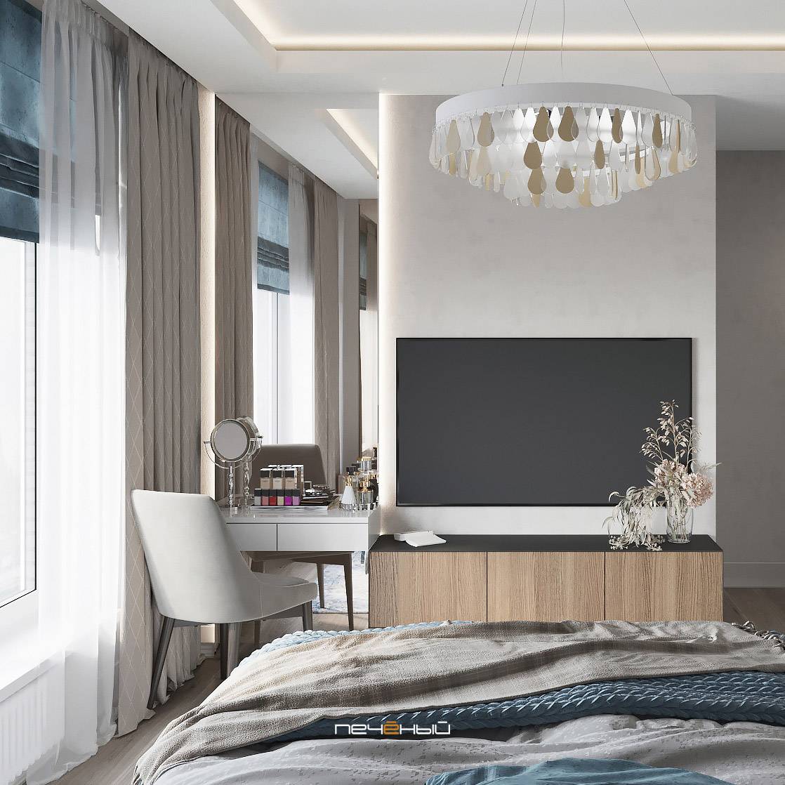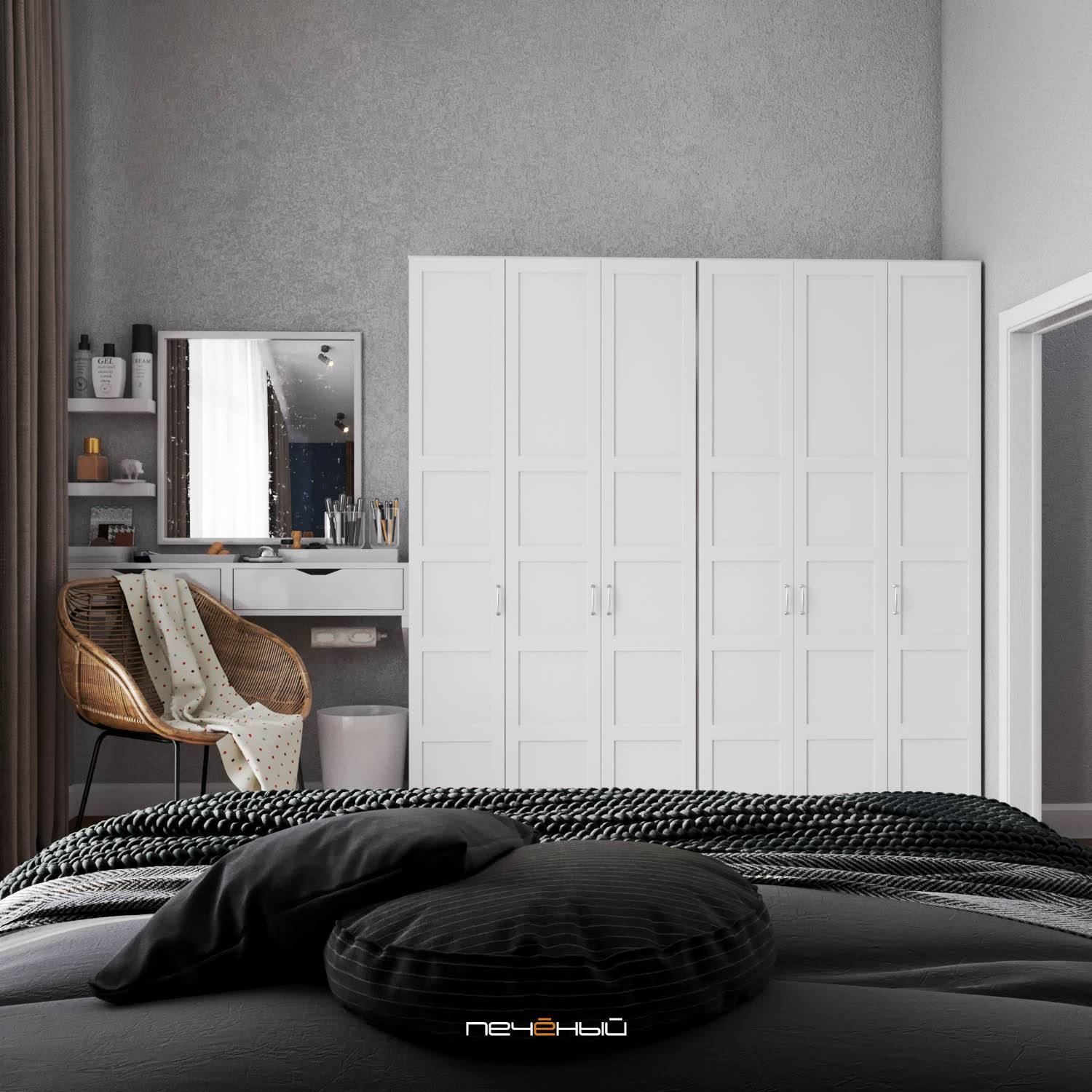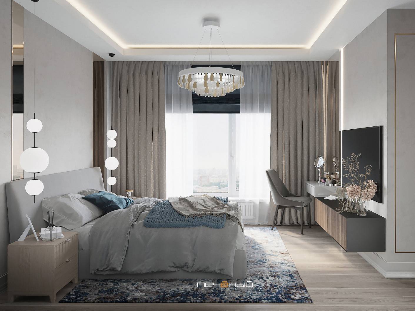 Отдельного упоминания достойны плотные серые шторы в спальне, они элегантно смотрятся в сочетании с белыми легкими тканями, и дают возможность затемнить комнату.