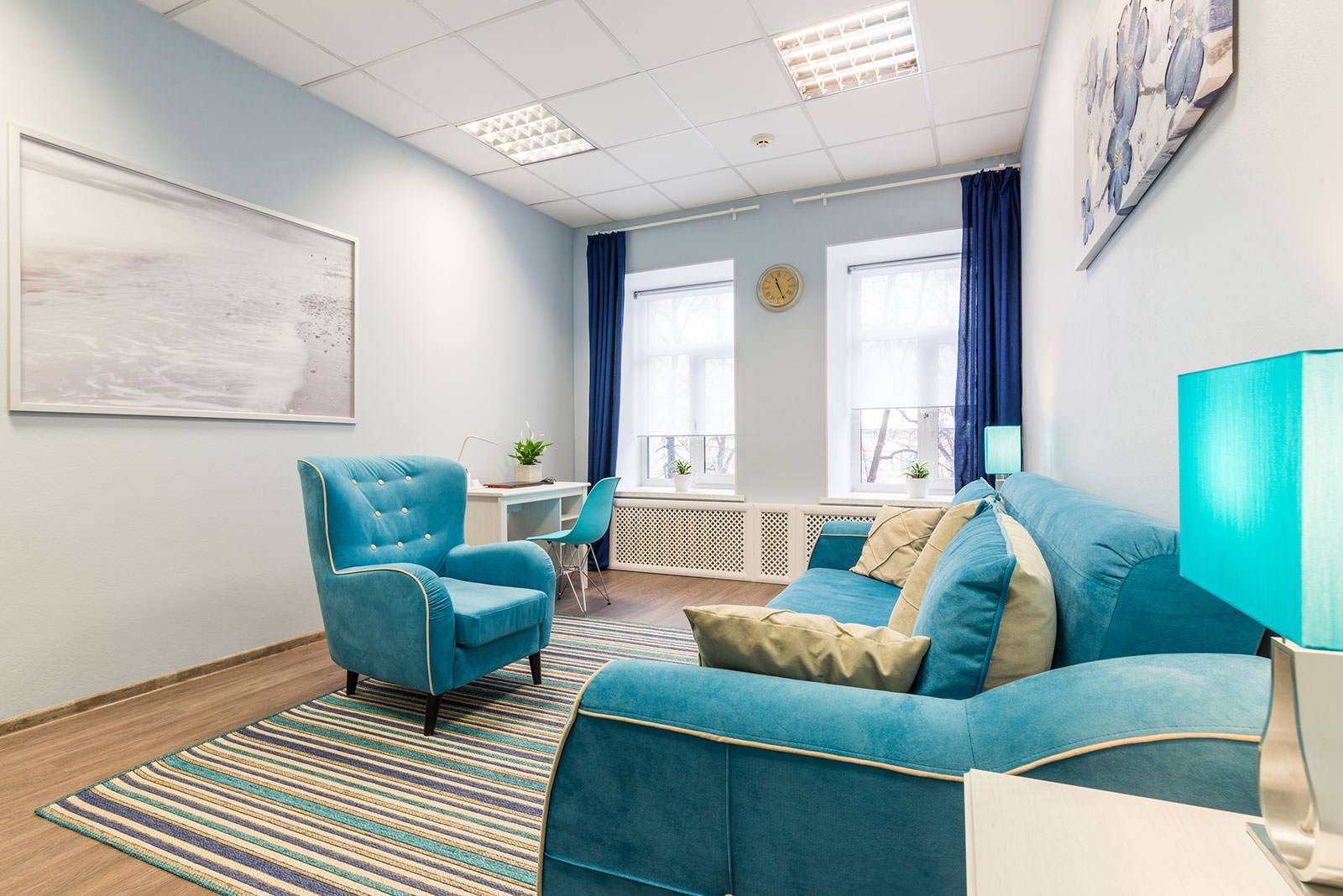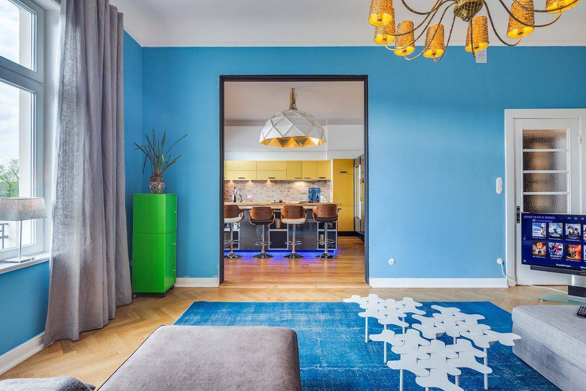 - Насыщенный голубой — наполняет пространство свежестью, делает комнату воздушной, и комфортной