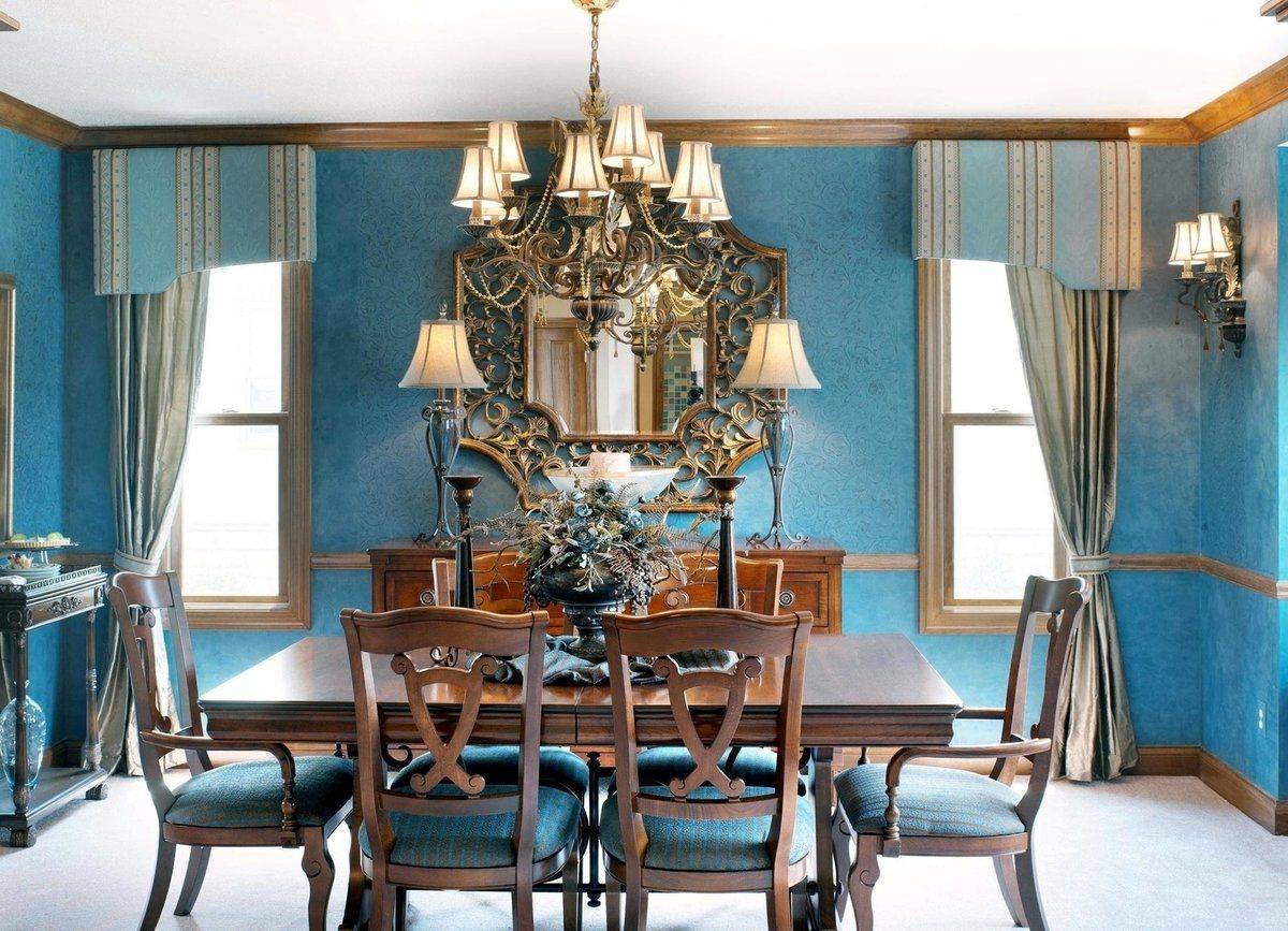 Для насыщенного голубого цвета стен хорошо подбирать мебель тёмного цвета
