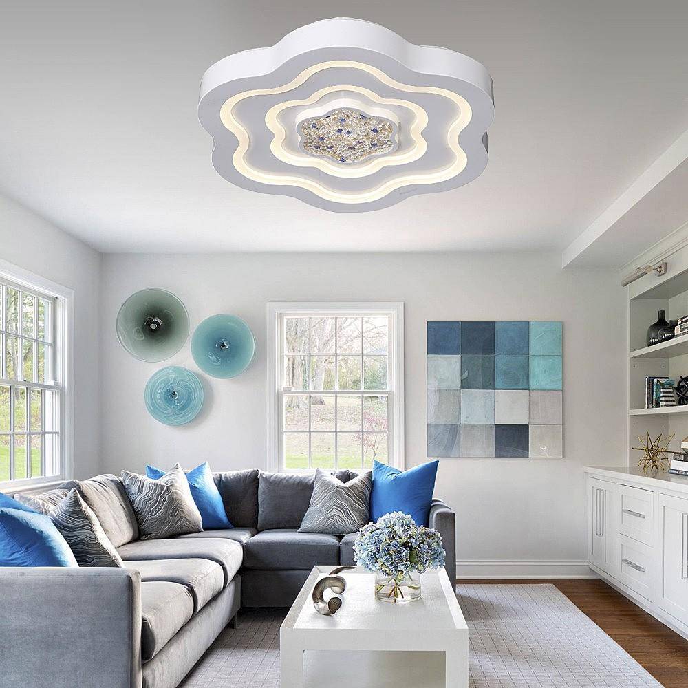 Для оформления потолка используйте белый цвет. Он подчеркнёт глубину голубого цвета стен. Натяжной глянцевый потолок будет отражать в себе голубизну стен и дневной свет, делая комнату более просторной.