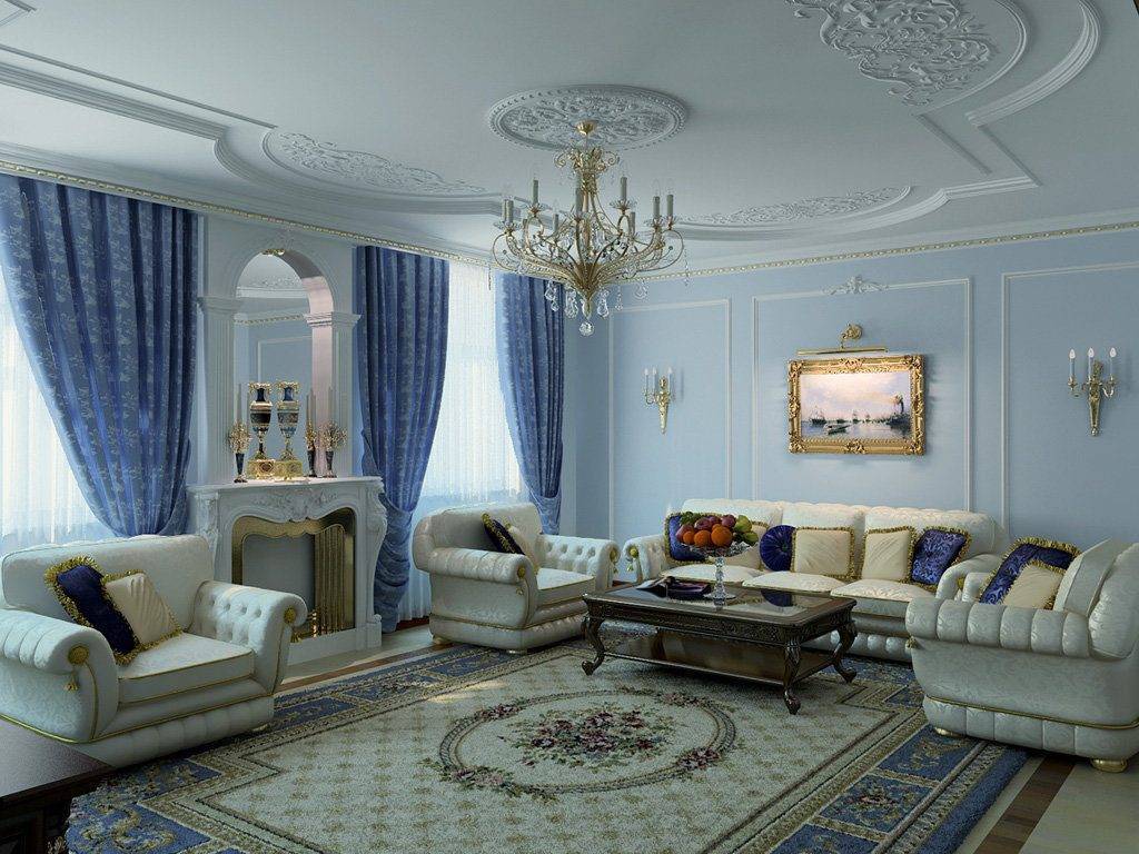 Во все времена применение голубого цвета считалось лучшим решением для интерьера в классическом стиле, да и в наше время он остаётся любимым у многих современных дизайнеров. Классический вариант дизайна – это апартаменты в бело-голубых тонах. Такой интерьер всегда выглядит грациозно и сдержанно, что подчеркивает высокое положение в обществе хозяина дома.