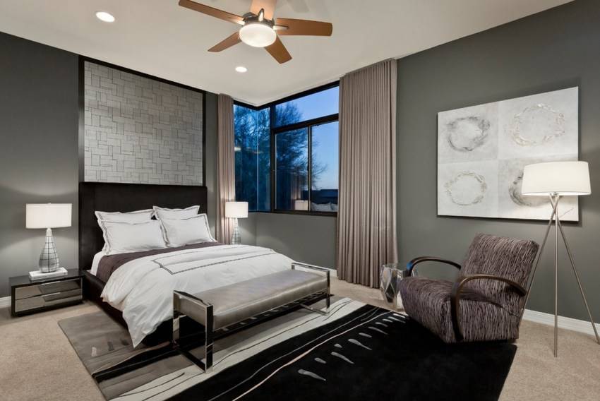 Серый с черным в классическом стиле подходит для чисто мужской спальни. Но достаточно ввести в эту цветовую гамму горошек, пейсли или дамаск и получится семейная спальня.