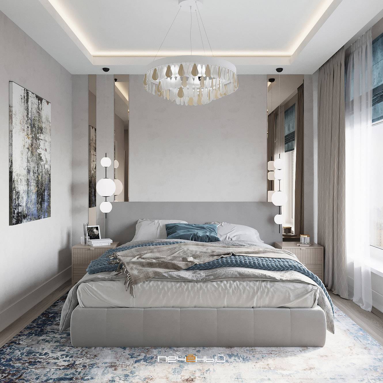 Эта современная спальня получилась лёгкой, светлой и умиротворяющей. Очень правильное настроение для спальни. 🙂