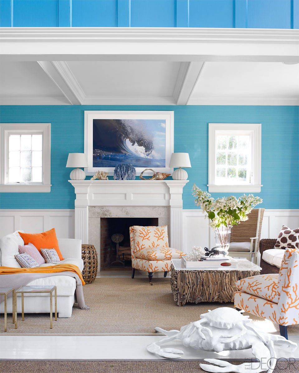 Голубой цвет отлично подойдет для оформления в морском стиле. Сам цвет ассоциативно приводит к мыслям о воде. В этом стиле голубой отлично дополнят синий и белый, в качестве акцентного – красный.