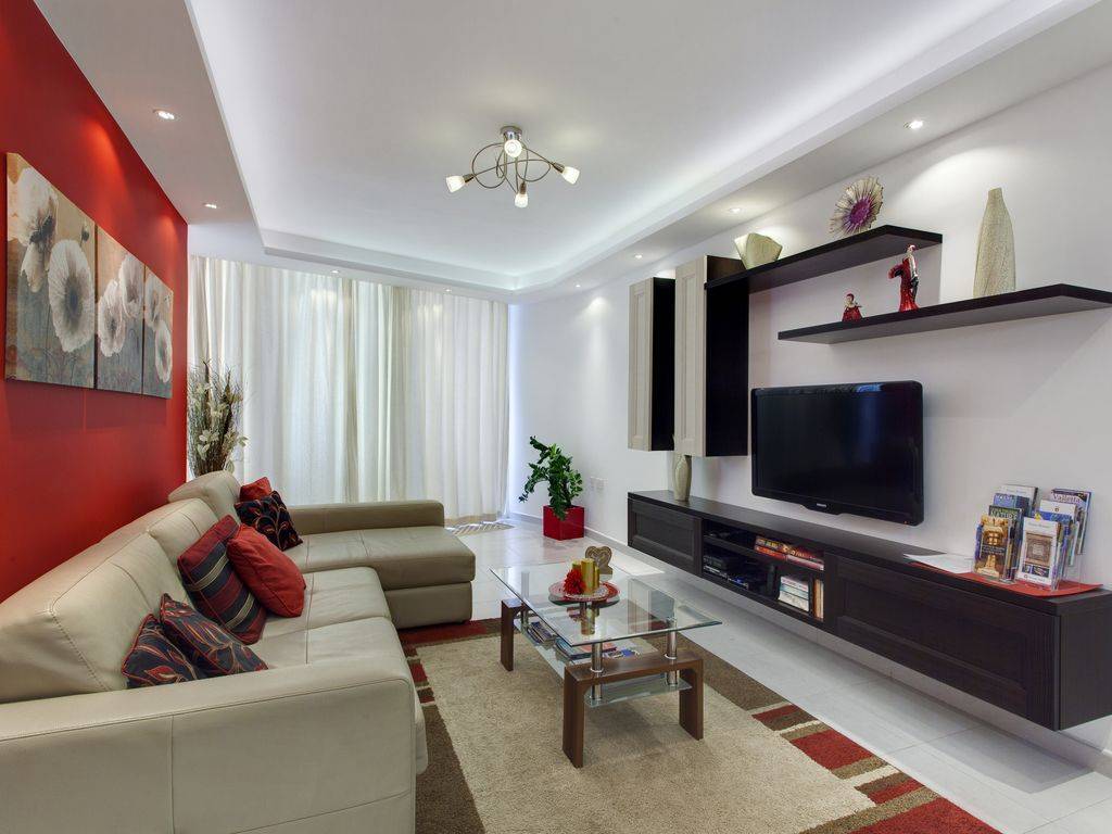 Телевизор лучше всего размещать на длинной стене и с использованием кронштейна. Таким образом можно будет не только сэкономить место, но и дополнительно придать легкости помещению.