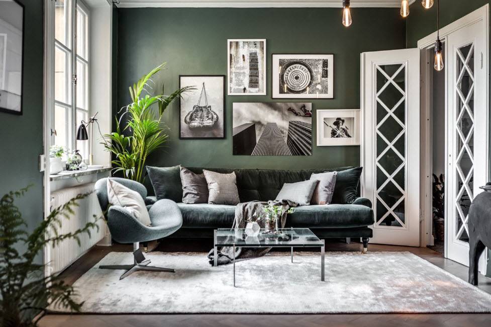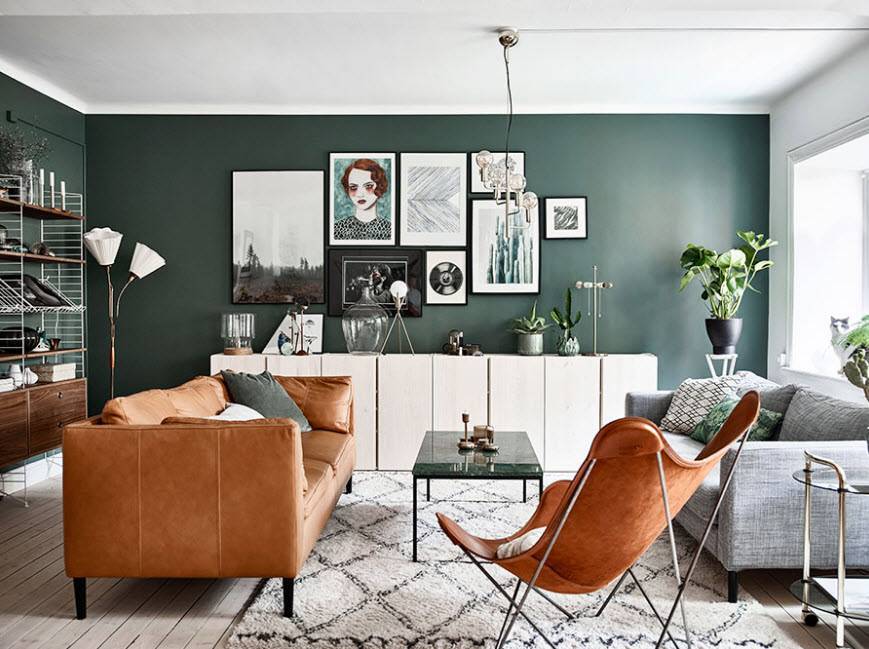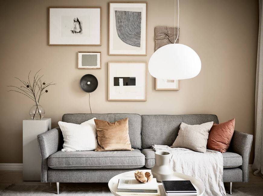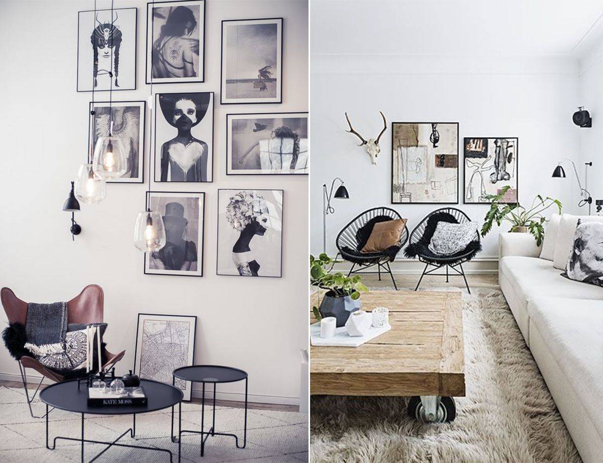 3. Картины и постеры. Для дома, оформленного в скандинавском стиле, характерна светлая внутренняя отделка. Чтобы гостиная или кабинет не выглядели скучно, стену над диваном или рабочим местом можно украсить коллажем из ярких картин и постеров.