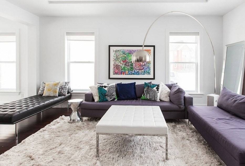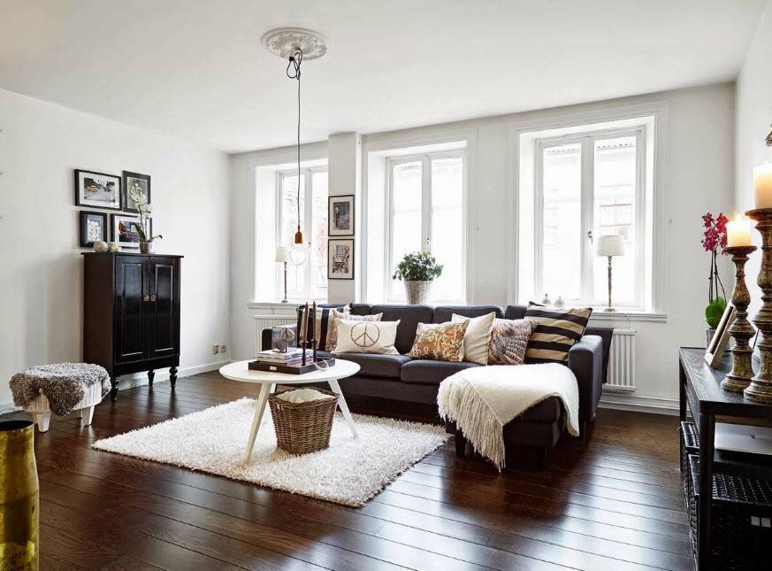 Уютный ковер с мягким ворсом возле дивана – классика стиля, он может быть однотонным или с традиционным орнаментом. Много текстильных изделий из натуральных тканей — еще одна особенность северного интерьера.