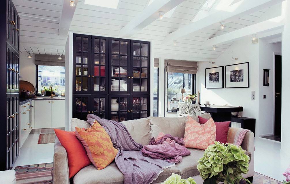 Потолки в скандинавских жилищах обычно выбеленные, их украшают деревянными балками и потолочными плинтусами темного контрастного цвета.