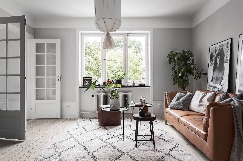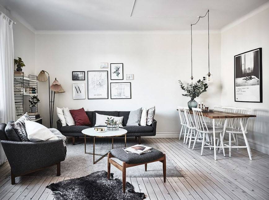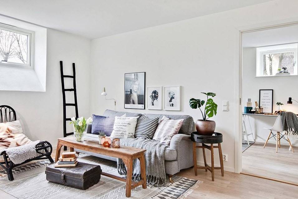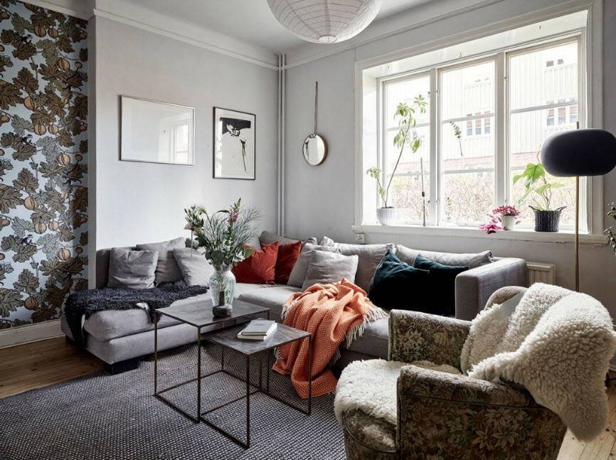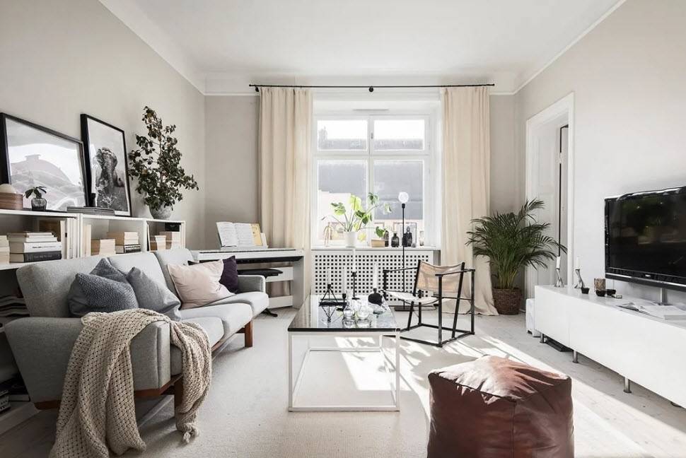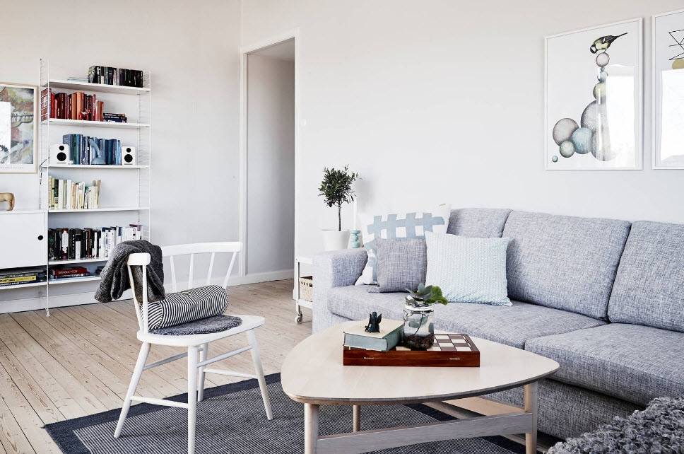 Скандинавский стиль в интерьере гостиной не обходится без серых ноток. Это может быть диван, ковер, вязаный пуфик, плед ручной вязки. Подобные полутона не отнимают свободного пространства, играют роль тени, поэтому выглядят естественно.