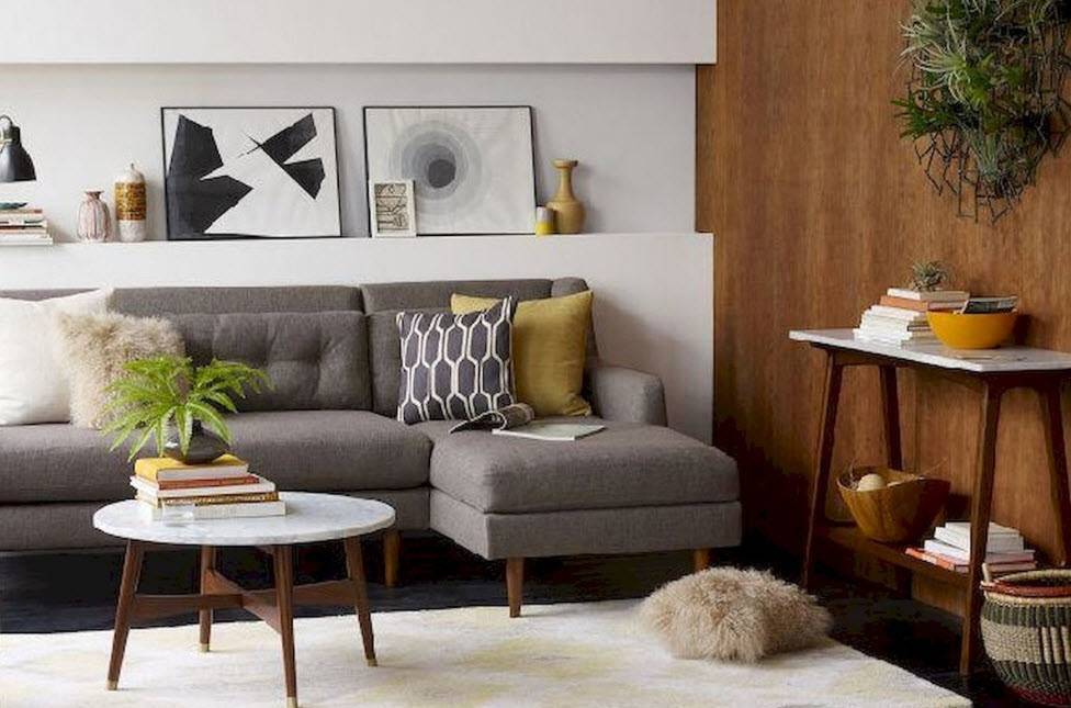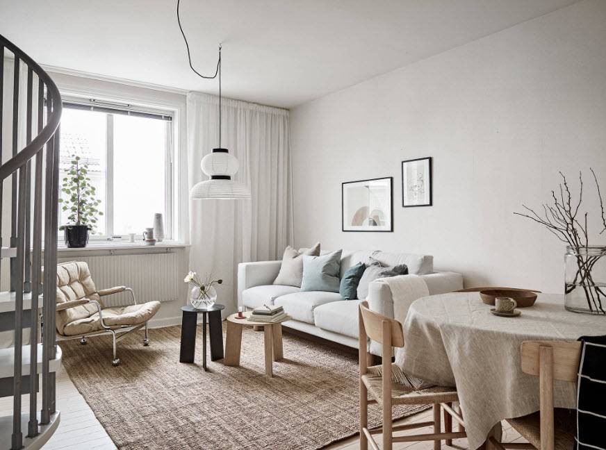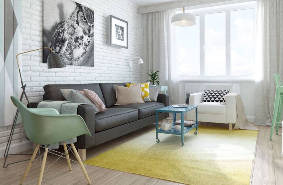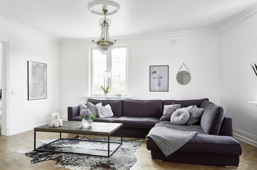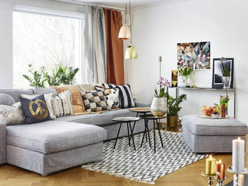 Скандинавский стиль в интерьере гостиной не обходится без серых ноток. Это может быть диван, ковер, вязаный пуфик, плед ручной вязки. Подобные полутона не отнимают свободного пространства, играют роль тени, поэтому выглядят естественно.