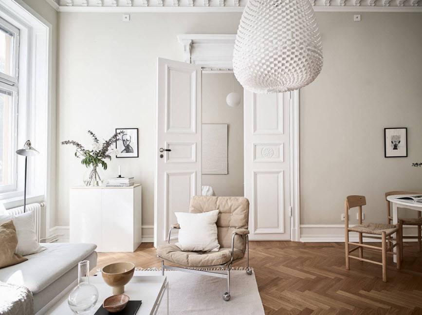 Тем, кто обожает обои с узорами, скандинавский стиль не подходит. Стены, потолок штукатурят, окрашивают в светло-серый, бежевый или белый цвет. Дизайн межкомнатных дверей лаконичен, цвет соответствует оттенку стен или цвету корпусной мебели, пола.
