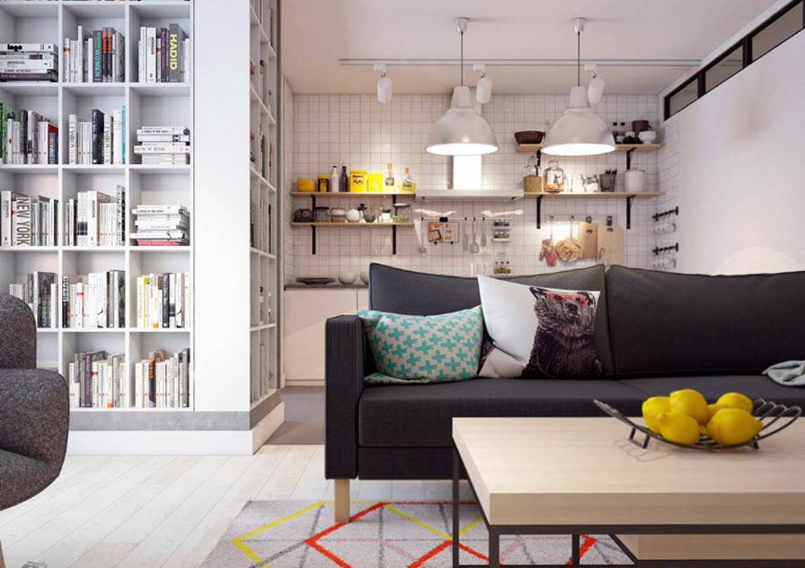 Книги, сувениры и прочие безделушки можно хранить на открытых полках, но важно оставить их частично свободными. Конечно, ключевым элементом гостиной служит диван, напротив которого располагают телевизор