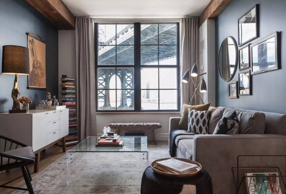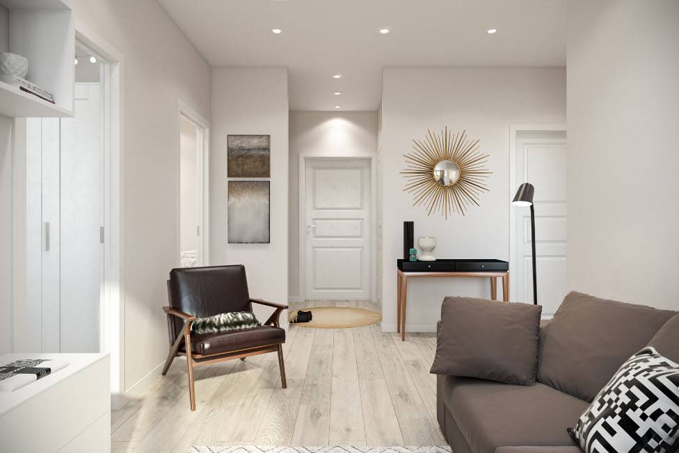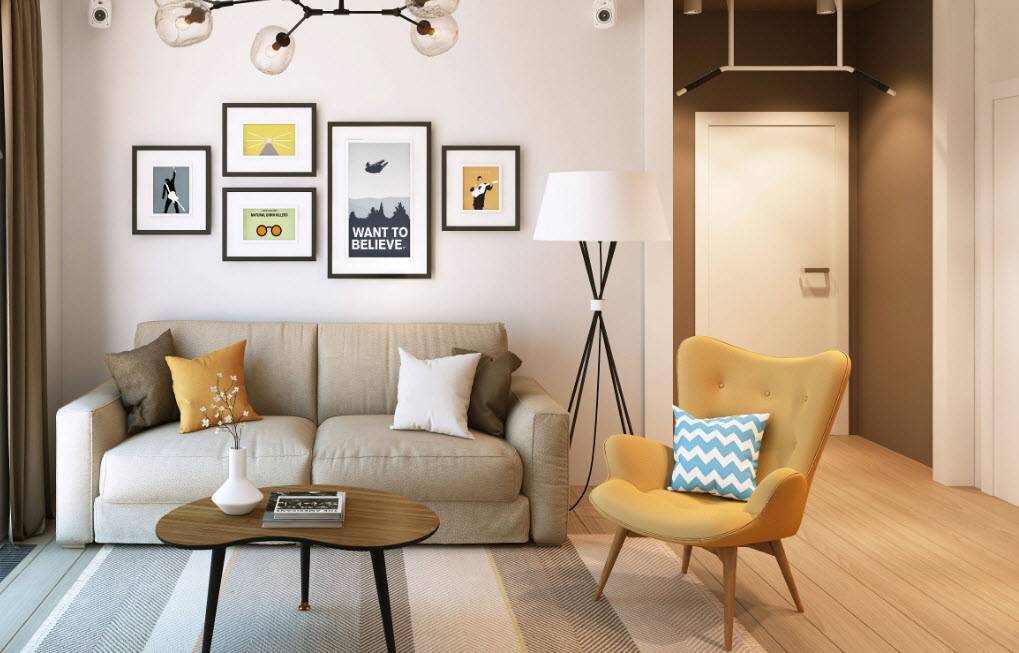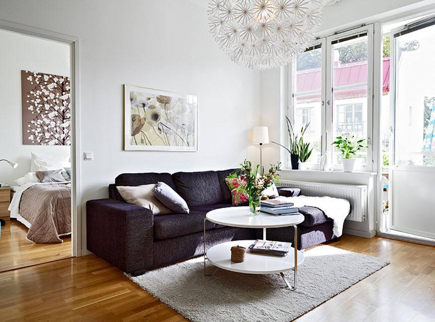 Оформление небольшой гостиной в хрущевке или другой малогабаритной квартире – практичное и правильное решение. Светлая отделка и мебель помогут визуально поднять потолок, сделать комнату просторной. Наличие серых вкраплений в маленьком помещении лучше исключить. А вот укладка светло-коричневого деревянного пола наоборот, поспособствует подчеркиванию особого уюта и комфорта. Для организации зоны отдыха рекомендуется выбрать небольшой диван и 1-2 кресла. Возле них можно установить компактный журнальный столик. Хорошим дополнением станет высокая тумба, расположенная рядом с диваном. В качестве декора рекомендуется использовать пару неярких настенных картин. Также подчеркнуть стилистику поможет расположение на тумбе небольшого вазона с зеленым растением. Шторы в малогабаритной гостиной лучше выбрать длинные до пола или короткие, закрывающие подоконник. Диванные подушки использовать не следует.