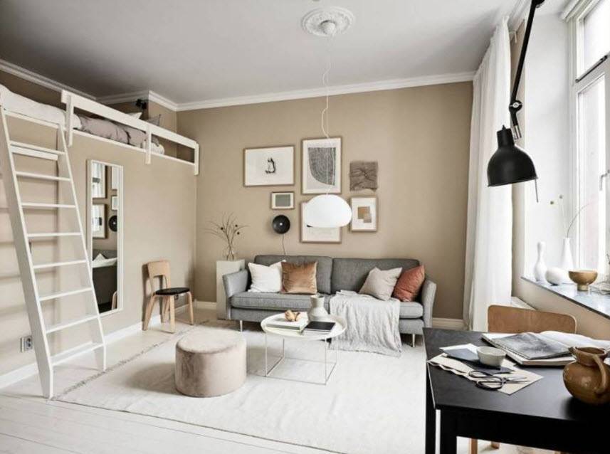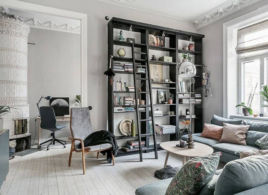 Скандинавский стиль в принципе не признает шкафов и хранения вещей в них, а значит, нужно обустроить кладовую или гардеробную, приобрести диван с раскладной конструкцией и скрытыми нишами