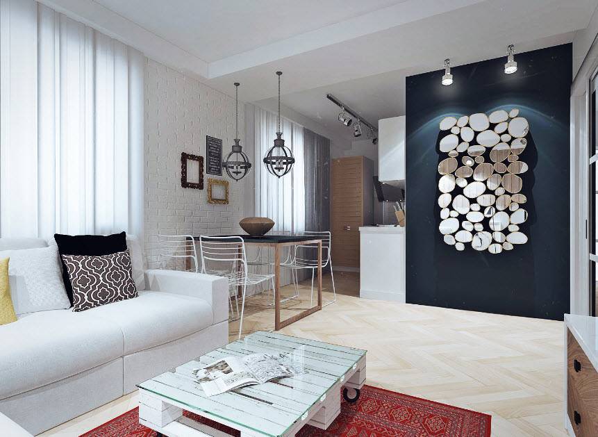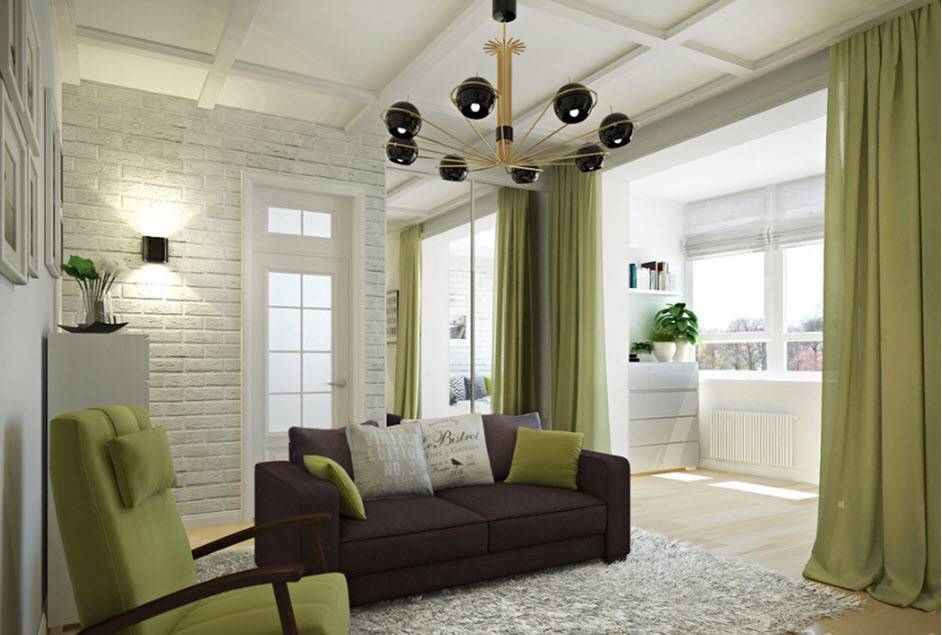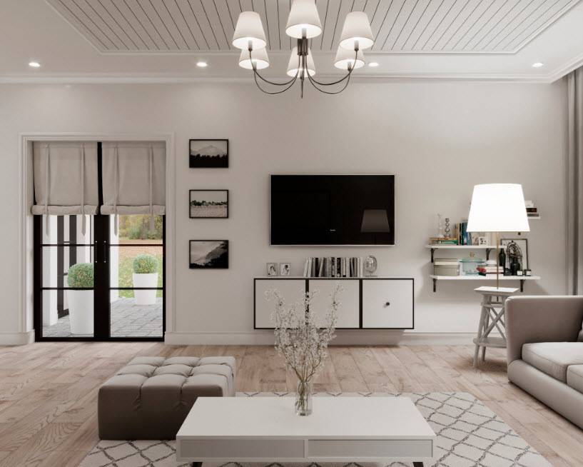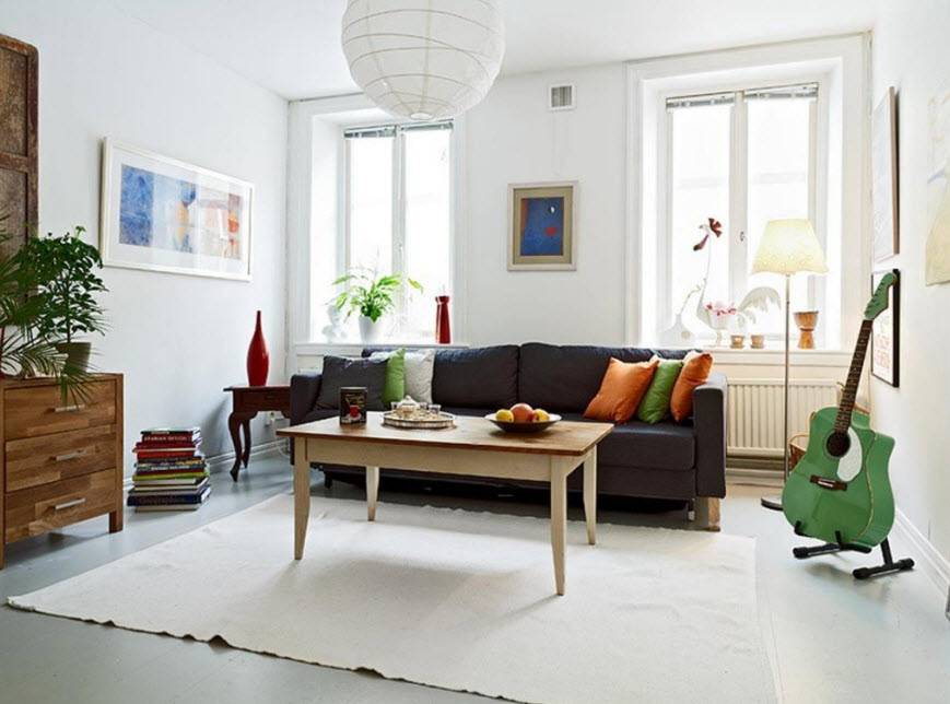 Дополнить интерьер можно вазонами с цветами (живыми или искусственными), а также небольшими сувенирами. При выборе текстиля нужно делать акцент на яркие тона, разбавляющие однотонный интерьер. К примеру, можно купить яркий ковер, подушки или плед, выполненные из натуральных материалов. Что касается занавесок, то можно использовать льняную ткань и сатиновые изделия, а вот подарить интерьеру гостиной уют поможет шерстяной плед коричневого или зеленого цвета. Декором здесь служат керамические и гипсовые изделия (свечи и шкатулки, корзины и вазы). Также приветствуются изделия ручной работы и семейные фотографии в оригинальных рамках.