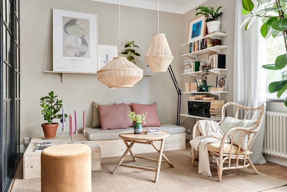 подчеркнут шведский стиль плетеные кресла и мягкие пуфики;