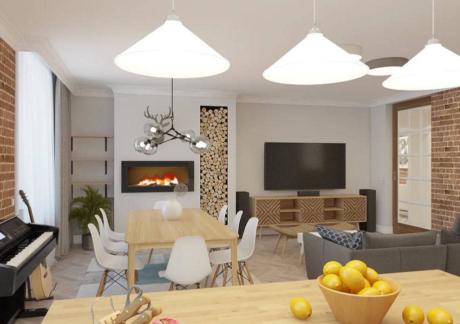 Главным требованием к освещению в скандинавской гостиной является его яркость и достаточность. Каждый угол светлой комнаты должен грамотно освещаться в любое время. В качестве основного осветителя рекомендуется выбрать подвесную люстру с нестандартным абажуром. Дизайнерская модель, состоящая из многочисленных элементов и включающая множество лампочек, идеально дополнит интерьер. Сам плафон может быть белым, черным, серым. Лаконично дополнить зону отдыха помогут торшеры или споты. Если комната обладает большой площадью, нелишними станут и потолочные точечные светильники, расположенные вдоль 1-2 стенок. Они помогут хорошо осветить удаленные части помещения. Также в удаленных углах гостиной владельцы могут установить 1-2 торшера. Современный электрический камин также может выступать в качестве вспомогательного источника света.