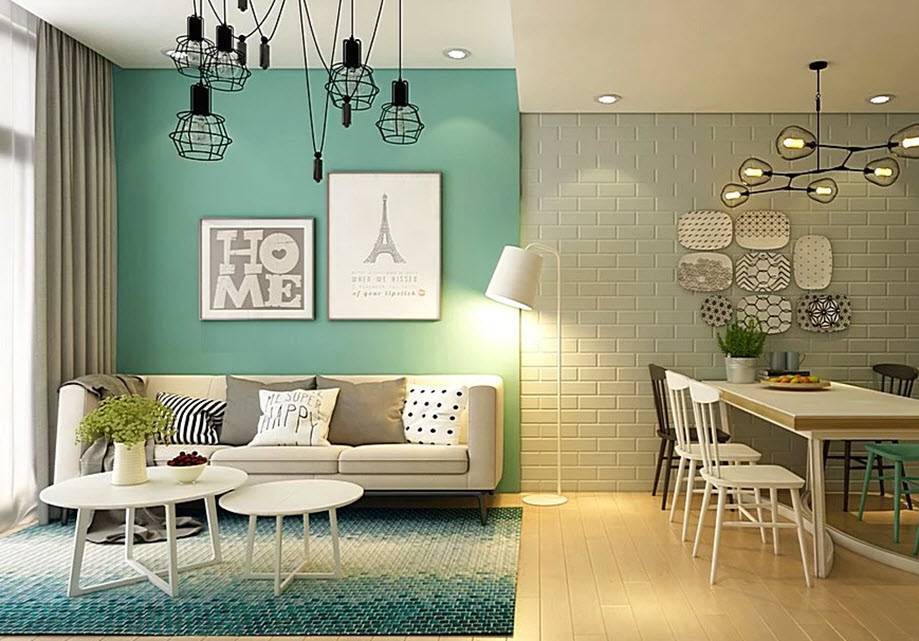 - зональные светильники (торшер у дивана, подвес в зоне столовой);
