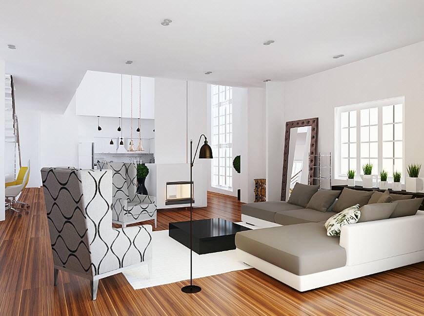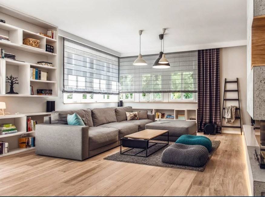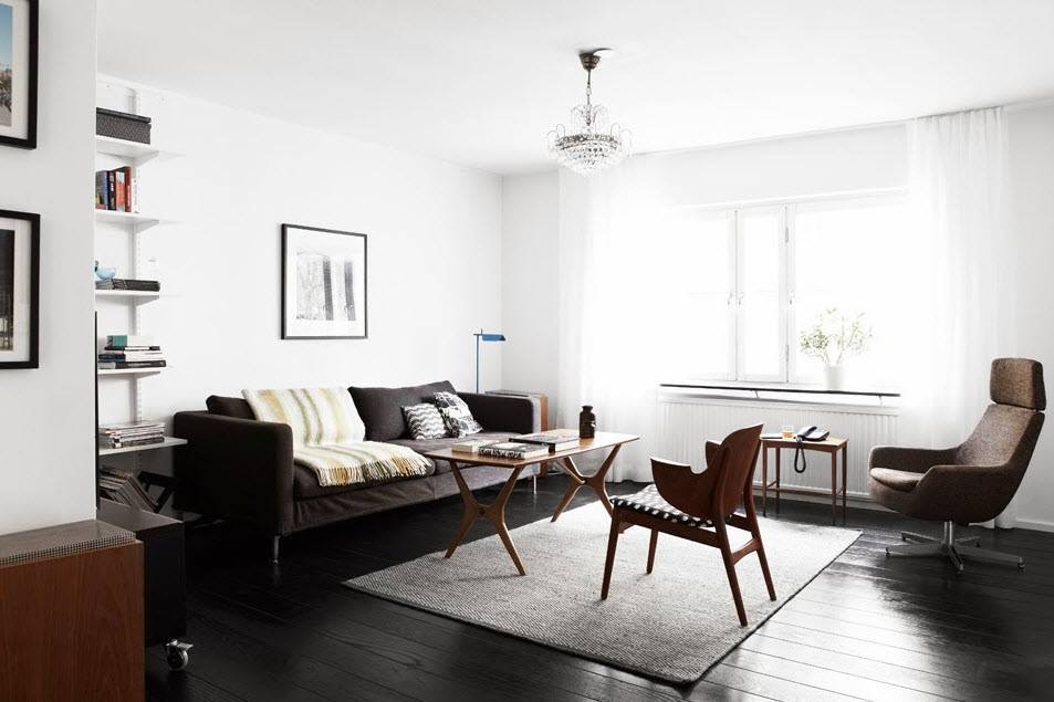 Цвет − важный критерий выбора отделочных материалов для пола. Он должен быть природным, выгодно оттенять и подчеркивать фактуру стен, мебели, элементов декора. Пол гостиной в скандинавском стиле может быть белым, светло-серым, цвета натурального дерева.