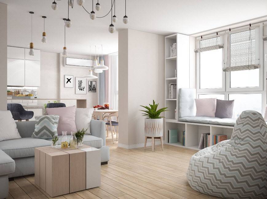 Гостиная в скандинавском стиле 2021 года — это зона комфорта. Даже небольшая комната в хрущевке уютна и удобна. Палитра оттенков скандинавского стиля светлая, отсылающая к северной природе, основной цвет белый или приглушенный бежевый, песочный, светло-серый, светло-коричневый.