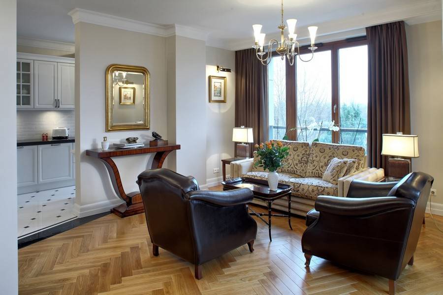 Расстановка мебели также имеет значение. Вместо привычного расположения вдоль стен, в гостиной арт-деко лучше применить грамотное зонирование, начиная планировку от центра. Здесь расположится журнальный стол, а уже вокруг него расставляются диван и кресла. Не стоит забывать о принципах симметричности и уравновешенности. Для полноты эффекта можно использовать дублирующиеся предметы мебели: стулья или небольшие столики.
