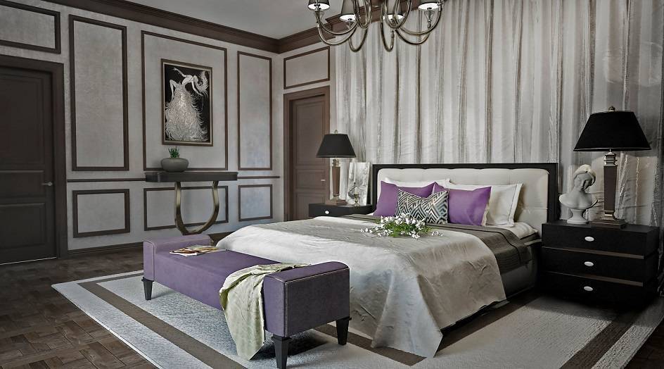 Этот стиль считается максимально приспособленным к комнате отдыха. Строгие формы мебели, интересные, но сдержанные украшения хорошо впишутся в интерьер. Тумбочки, комоды и шкафчики стараются приобретать из натурального дерева. Они могут иметь округлые формы без присутствия острых углов. Стены спальни в зоне изголовья кровати стараются отделывать обоями с имитацией шелка и другого богатого текстиля. По обеим сторонам располагают ночники. Одну из длинных стен в комнате можно полностью заставить мебелью.
