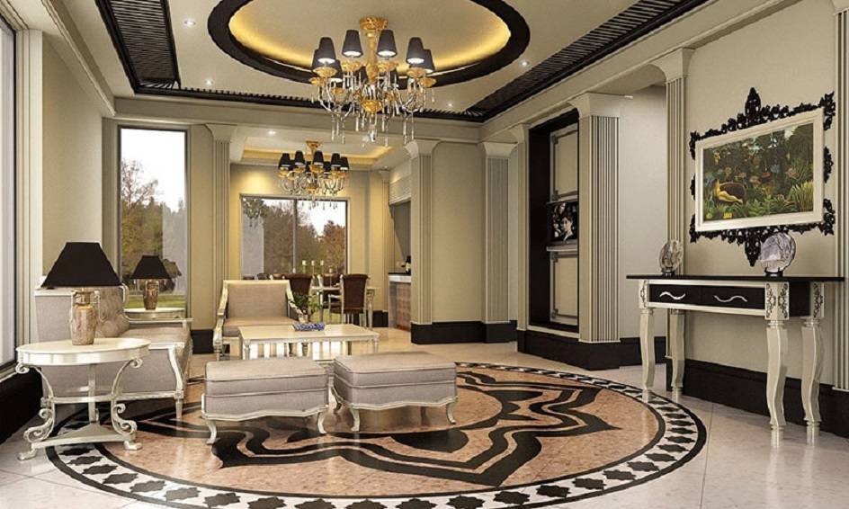 Потолочную зону, даже если на ней предусмотрены светильники, обязательно дополняют лепниной. При этом оттенок поверхности может быть бледно-розовым, молочным или светло-серым. Чтобы создать контраст стараются использовать темное покрытие пола (ламинат, кафель, деревянный паркет).