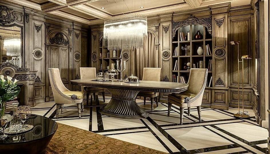 Уместно впишется в дизайн гостиной массивный стол из натурального дерева с дорогой инкрустацией, дополненный высокими стульями или королевскими креслами. Для такого гарнитура подойдут красные или бордовые породы дерева в сочетании с натуральной кожей белого цвета, стеклом или мрамором.