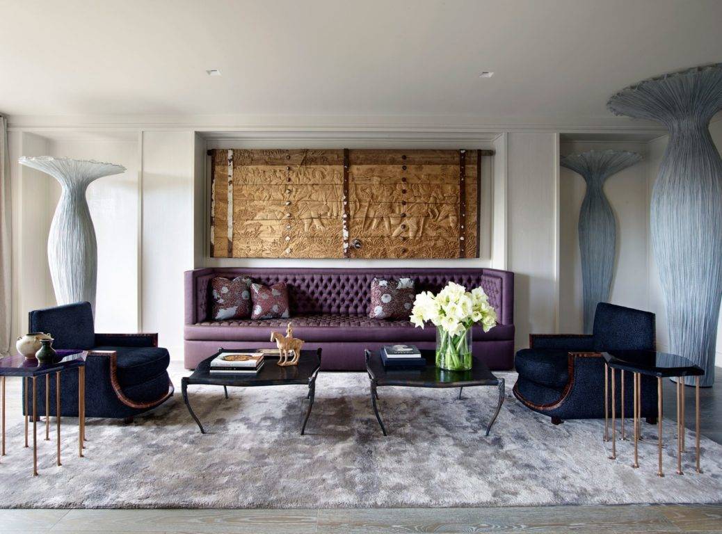 Мебель для такой гостиной нельзя купить в обычном мебельном магазине, поскольку стиль не приемлет вещей массового производства. Оригинальные предметы мебели часто изготавливаются на заказ в единственном экземпляре. Для этого используются дорогие материалы и экзотические породы дерева. Форма мебели может быть очень необычной, например, корпус в виде геометрической фигуры с изогнутыми ножками, а обивка украшена древнеегипетскими или восточными орнаментами.
