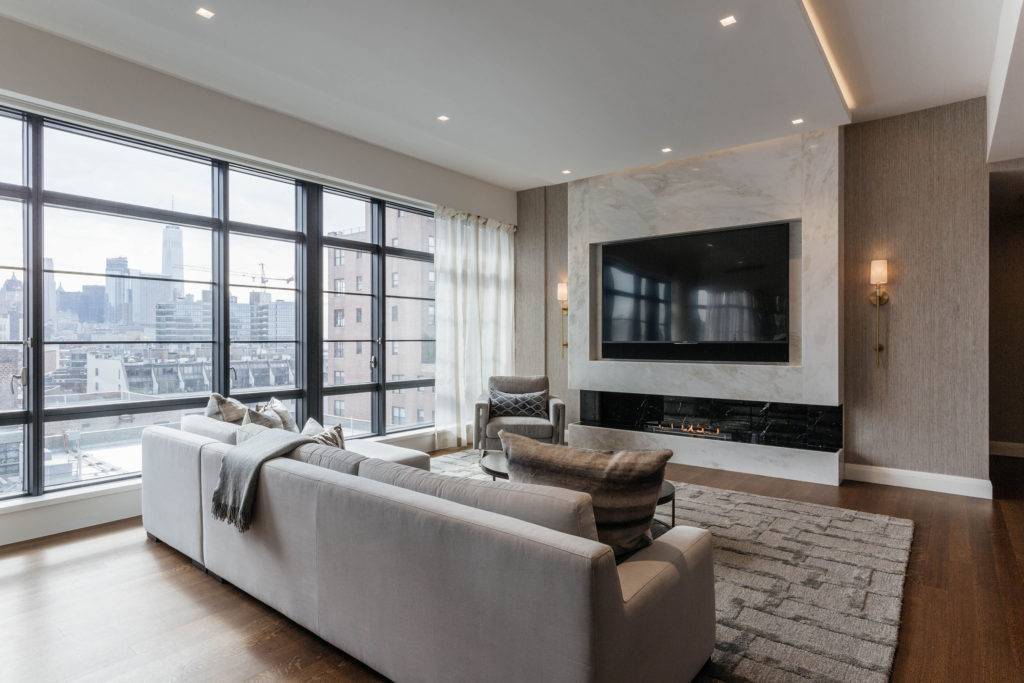 В просторном помещении этот элемент дизайна создает каминную зону с установкой углового дивана или кресел, кофейного или журнального столика.