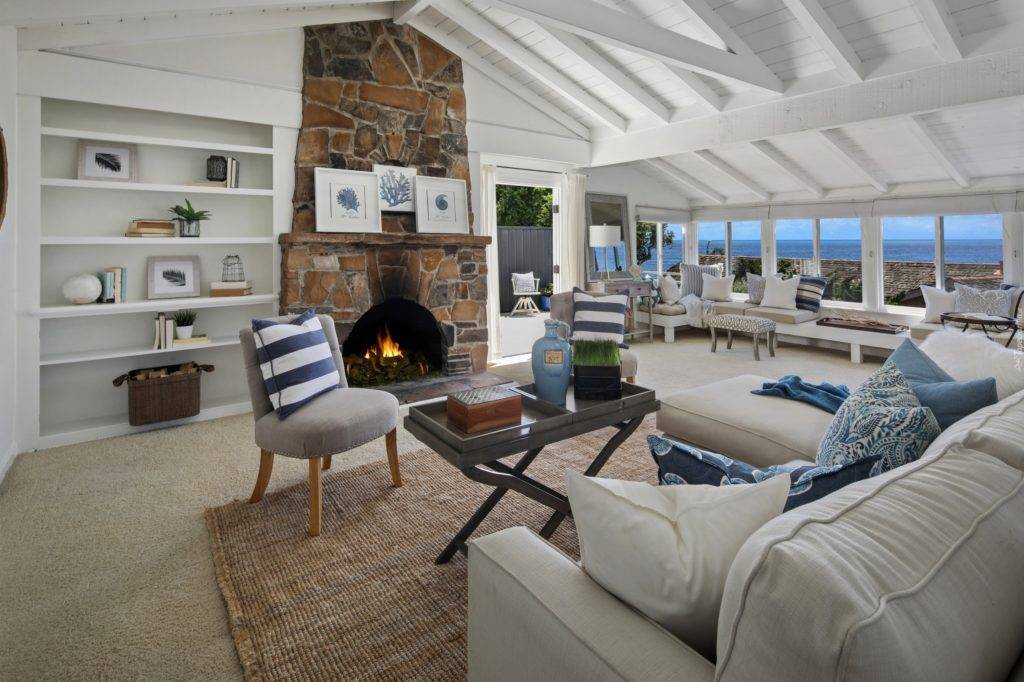 Обставляя уютную гостиную с камином, не забудьте разработать очаровательную зону отдыха. Выберите мягкий диван с бежевой обивкой и расставьте на нем несколько подушек, которые будут выделяться оригинальным мотивом или интенсивным цветом, например, темно-синим. На спинку, небрежно накиньте теплое одеяло — в прохладные вечера вы будете накрываться им, а днем оно будет служить украшением пространства.