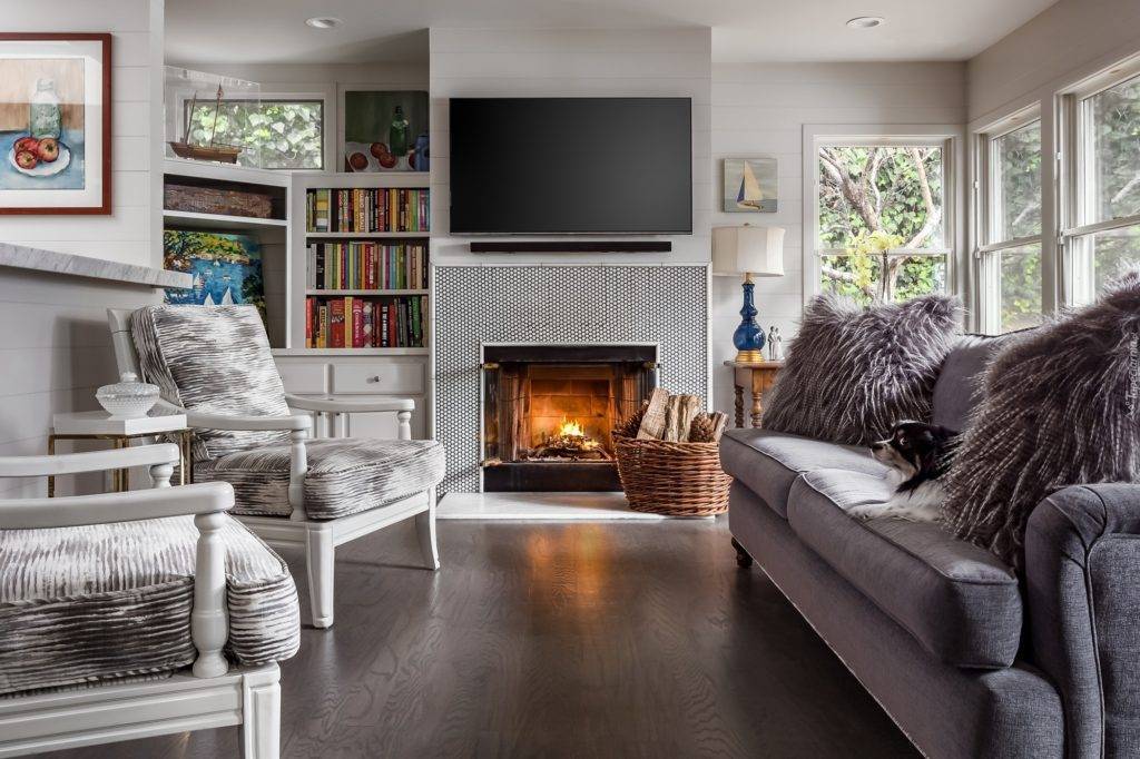 Вы можете обустроить гостиную с камином и телевизором, выбрав отдельно стоящий камин, который не должен находиться слишком близко к устройству, поскольку высокая температура его повредит. Вы также можете установить камин в углу стены, отделяющей кухню от гостиной, размещение которого обеспечит комфорт при просмотре ваших любимых фильмов.