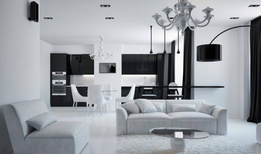 Сочетание белого и черного смотрится оригинально вместе с яркими деталями – декоративные подушки, ковер, посуда (если гостиная объединена с кухней).