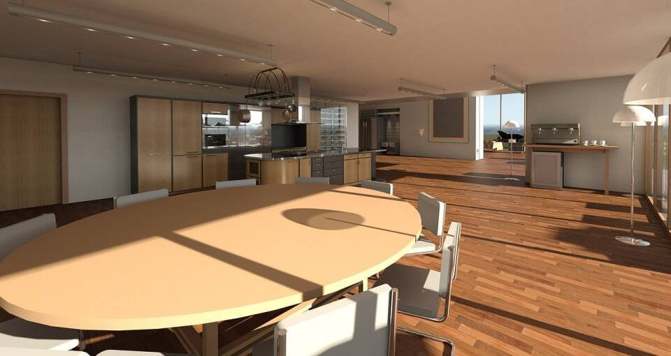 - Пространство должно быть максимально открыто, поэтому не используйте для зонирования перегородки, стеллажи и пр. Лучше используйте свет и прозрачные ширмы.