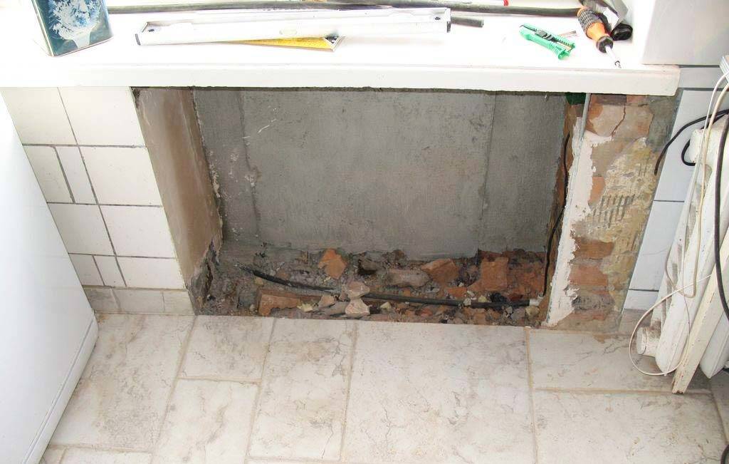 - Установка батареи на месте холодильника. Нишу под подоконником на кухне закладывают почти полностью, остается лишь небольшое углубление в 10–15 см. На месте бывшего холодильника монтируют источник тепла.