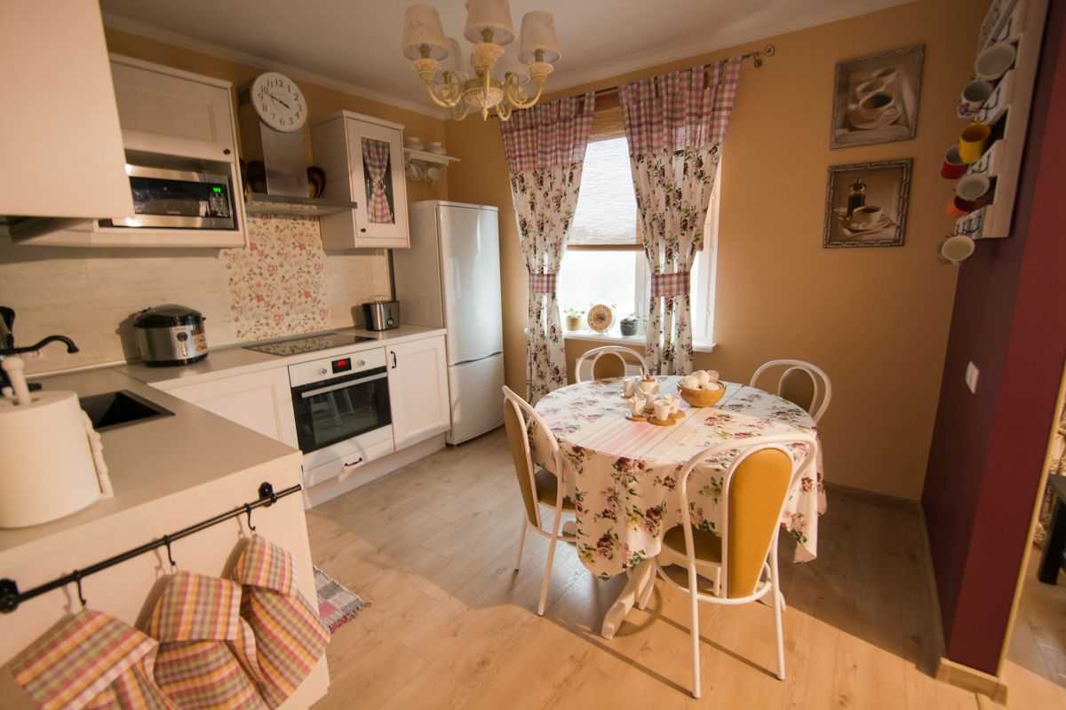 Преобладают белые потолки, в которых подчёркнуты резные карнизы, стены с мягкими пастельными тонами. Используются бежевые, молочные и медовые оттенки. Пол сделан из высококачественной осветлённой плитки. Мебель необходимо выбирать с тёмными цветами. Чтобы интерьер олицетворял домашний уют и аристократичность, в небольшой кухоньке можно повесить картину или шикарную люстру.