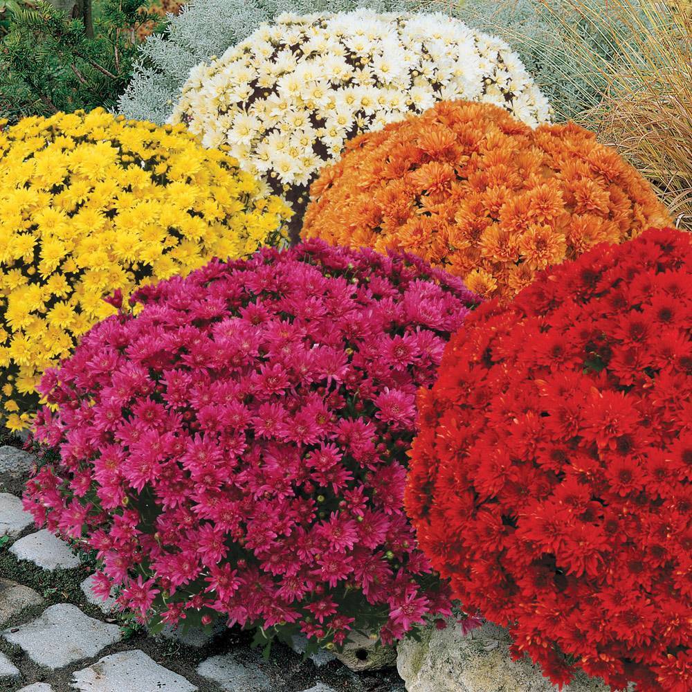 Очень красиво будут смотреться шарообразные хризантемы на цветниках, особенно если они размещены возле дома. Сочетать можно самые разные цвета, например, желтые, красные, фиолетовые. Рядом можно высадить обычные хризантемы. Разместить их лучше всего в центре композиции.