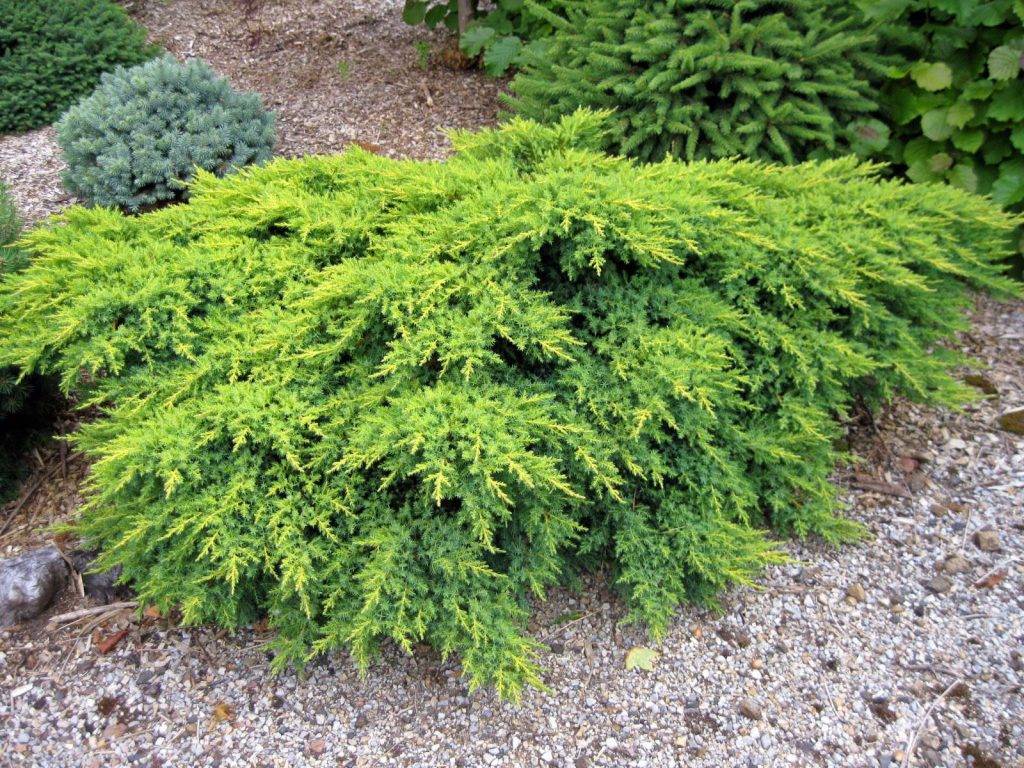 В центре высаживают скальный можжевельник Скайрокет, рядом помещают несколько кустов казацкой пестрой Вариегаты. Нижний ярус представляют карликом Блю Чип.
