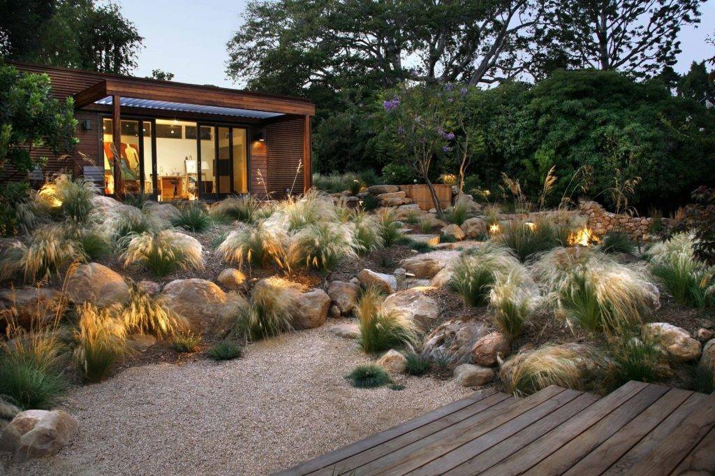 Овраг. Обычно появляется из-за нарушений в землепользовании. Проблема таких участков — в быстром углублении и увеличении длины оврагов. Чтобы избежать этого, нужно отвести поверхностные воды от него. Если овраг невелик, его можно заполнить глинистой почвой с трамбованием каждого слоя. Если он достаточно большой, склоны укрепляют дерном, растениями с развитыми корневыми системами. До их посадки можно укрепить грунт георешеткой. На дне оврага можно сделать сухой ручей или сформировать затененную зону отдыха. В его оформлении можно и нужно использовать камни. Это красиво и «полезно» для участка: валуны смогут укрепить дно и стенки оврага.