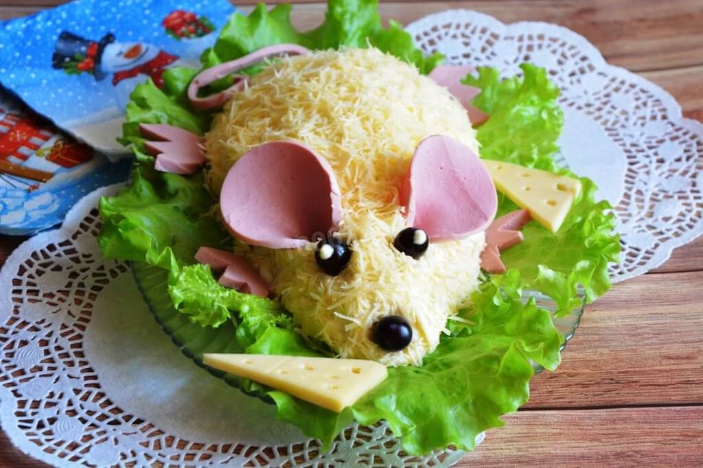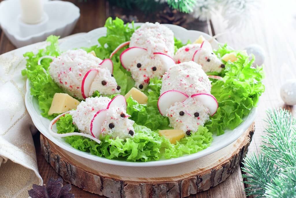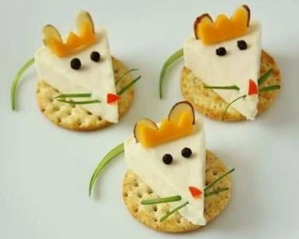 Крыса очень любят покушать, поэтому праздничный стол должен выглядеть обильно, и речь не только про еду. Помимо елочных декоративных композиций, любимого продукты красы — сыра (лучше выбирать белые сорта — горгонзола, бри, моцарелла, камамбер) стол на Новый год можно сервировать иными способами. Вот несколько из них: