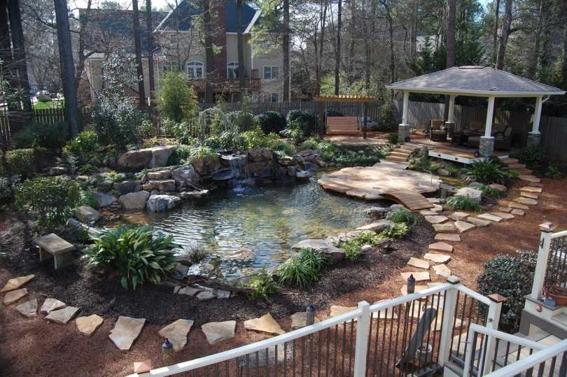 К небольшому водоему, размещенному около веранды, ведет красивая садовая дорожка с натуральным камнем и галькой, которая переходит в очаровательный маленький мостик из камней. Шум маленького водопада позволяет получить не только зрительное удовольствие, но и полностью расслабиться после трудовых будней. Используя красивые декоративные травы, подсветку и тематические садовые фигурки, вы придадите этой площадке около дома действительно роскошный вид.