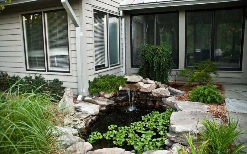 Если вы хотите наслаждаться не только видом, но и шумом воды, дополните пруд маленьким водопадом или фонтаном. Вам придется приобрести насос, а остальное можно сделать своими руками.