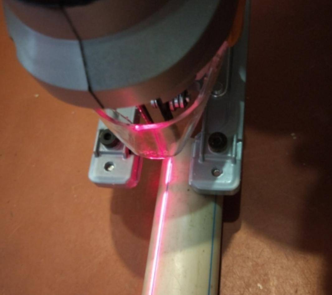 Работает от адаптера, ним же и осуществляется управление мощностью. Скорость резки без нагрузки – 7000 об/мин. Благодаря линейке, нанесённой по краям стола, и ограничителю можно сделать точные разрезы.